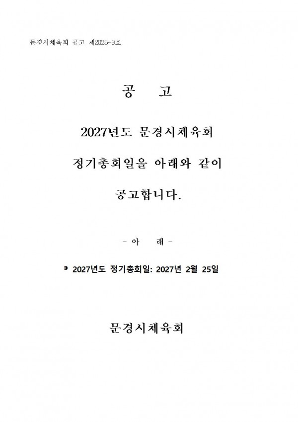 2027년도 문경시체육회 정기총회일 공고 작성일 25-12-15 17:39 조회 20회 작성자 문경시체육회 본문 2027년도 문경시체육회 정기총회일 공고 목록 다음글당선인 공고 22.12.22 댓글 0 댓글목록 등록된 댓글이 없습니다.