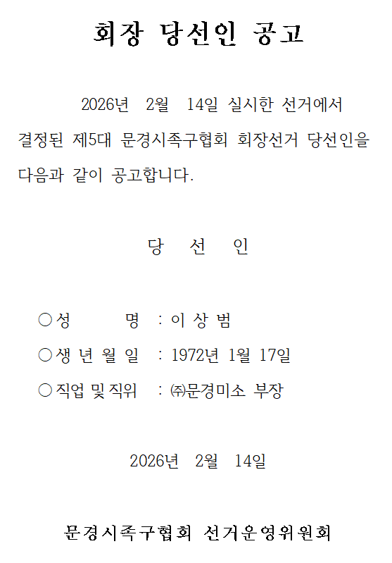 문경시족구협회장 당선인 공고 작성일 26-02-19 09:47 조회 27회 작성자 문경시체육회 본문 . 목록 다음글문경시족구협회장 선거 공고 26.01.30 댓글 0 댓글목록 등록된 댓글이 없습니다.
